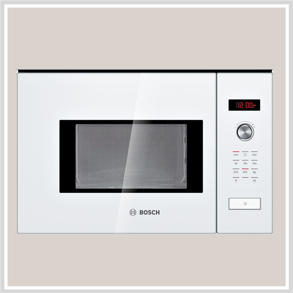 Lò vi sóng Bosch HMT75M624 thiết kế bằng màu trắng tinh thể tạo điểm nhấn nổi bật sang trọng trong không gian bếp.
